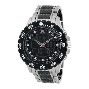Durable and awesome bracelet watch featuring round case, black rotating bezel with white minute tracks, gun metal and plastic link band with double-push-button safety clasp. Dual time display - analogue and digital. 12 digitals LCD display, showing hour, minute, second, day, month and date. There may also be EL backlight, daily alarm, chime hourly, stopwatch and 1/100 second chronograph with split function. Tachymeter scale marked on inner bezel.